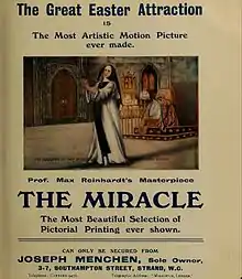 This 1912 multi-media experience was an adaptation of Max Reinhardt's wordless spectacular stage production of Karl Vollmoeller's play of the same name, which had played to huge audiences at the Olympia, London exhibition hall in 1911–1912. As some contemporary critics realised, The Miracle was not a "moving picture drama" in the normal sense of the word, but a "filmed pantomime," a celluloid record of the action of the stage production in a unique presentation.[7]