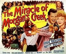 The Miracle of Morgan's Creek is a 1943 American screwball comedy film written and directed by Preston Sturges, starring Eddie Bracken and Betty Hutton, and featuring Diana Lynn, William Demarest and Porter Hall. Brian Donlevy and Akim Tamiroff reprise their roles from Sturges' 1940 film The Great McGinty.