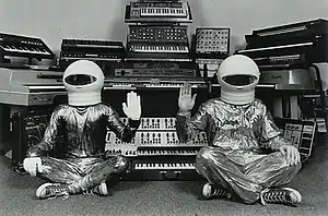 The band's name is derived from a 1978 cookbook, Moog's Musical Eatery, written by Shirleigh Moog, the first wife of synthesizer pioneer Robert Moog.[3] On stage and in their promotional materials, they donned space-suit disguises that were similar to outfits worn by another emerging electronic duo, Daft Punk. This was reportedly only a coincidence.[1] Kehew said that "The look of Moog Cookbook can be traced back to those kinds novelty bands like the Spotnicks and French disco band, Space, who had a hit with "Magic Fly" in 1977 and wore astronaut helmets and plastic jumpsuits. I know Daft Punk were into them too."[1]