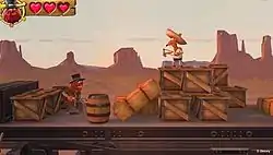 Each stage features a different player character and is centered around a particular movie genre (for example, level three is a western film), and features a unique story not related to other levels. At the end of each stage is a boss battle. Scattered throughout each level are collectibles as well.