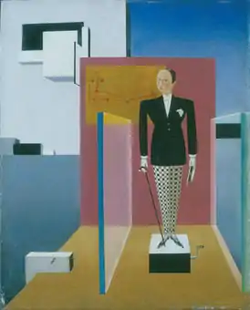 Sándor Bortnyik falls among the representatives of Constructivism. From 1922 to 1924, he lived in Weimar, where he met artists from the Bauhaus. He painted abstract two- and three-dimensional compositions, to which subsequently added figures and objects. In the composition The New Adam he describes an ironic ideal of "modern" man in the 1920s. It shows an extremely fashion-conscious man who is fragile, like clockwork. With this and other paintings, Bortnyik ironically applied the "brave new world" of constructivism. The artist uses precise details, geometric shapes and colors in abstract composition. He manages to satirize utopian ideals, but cannot avoid them because he is an active participant in the formation of a "new world“.[2]