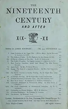 The magazine was designed as an 'utterly impartial' forum for debate and discussion among leading intellectuals.[2] Many of the early supporters and contributors to The Nineteenth Century were members of the Metaphysical Society, of which Knowles had been secretary. The first issue, for example, contained pieces by former Society members Lord Tennyson, William Gladstone and Cardinal Manning.[3] It quickly became one of the most successful literary magazines in Britain, selling over 20,000 copies a month by early 1878.[4]