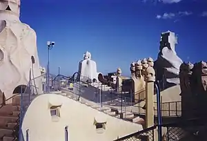 - The camera ran on a ceiling track in the hotel room and when it came outside the window, was meant to be picked up by a hook suspended from a giant crane nearly 30 metres high. A system of gyroscopes was fitted on the camera to steady it during the switch from this smooth indoor track to the crane outside. Meanwhile, the bars on the window had been given hinges. When the camera reached the window and the bars were no longer in the field of view, they were swung away to either side. At this time the camera's forward movement had to stop for a few seconds as the crane's hook grabbed it and took over from the track. To hide this, the lens was slowly and smoothly zoomed until the crane could pull the camera forward.[Note 1] Then the cameraman walked the camera in a circle around the square, giving the crew time to shut the window bars before the camera returned to look through the window from the outside this time. Antonioni directed the scene from a van by means of monitors and microphones, talking to assistants who communicated his instructions to the actors and operators.[5]