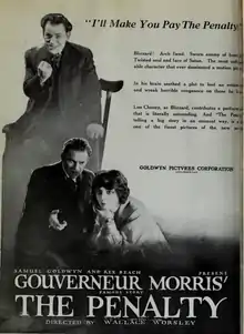 The Penalty is an American crime film starring Lon Chaney and originally released in 1920 by Goldwyn Pictures. The movie was directed by Wallace Worsley, and written by Philip Lonergan and Charles Kenyon, based upon the pulp novel by Gouverneur Morris. The supporting cast includes Charles Clary, Doris Pawn, Jim Mason, and Claire Adams.[1]