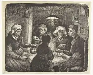 Van Gogh made a lithograph of the composition The Potato Eaters before embarking on the painting proper. He sent impressions to his brother and, in a letter to a friend, wrote that he made the lithograph from memory in the space of a day.[10]
