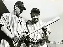 Multiple published sources[6][7] have asserted that Cooper, who was right-handed, could not master a convincing left-handed swing. To remedy the problem, the story went, he was filmed wearing a mirror-image uniform and swinging from the right side of the plate, then running to third base instead of first; technicians then purportedly flopped the print of the film. Tom Shieber, Senior Curator at the National Baseball Hall of Fame, has shown, however, that Cooper did indeed learn to bat left-handed, and never wore a backwards Yankees uniform nor ran to third base after swinging.[8] Film footage was, in fact, flopped only once, during a brief sequence portraying Gehrig's minor league days at Hartford, in order to make Cooper appear to be throwing left-handed — a far more difficult task for a right-hander to master. ("[Cooper] threw the ball like an old woman tossing a hot biscuit," said Lefty O'Doul, who tried unsuccessfully to teach him a convincing left-handed throw.)[5] Scenes requiring Cooper to throw a ball as a Yankee were filmed using his stand-in, the left-handed Babe Herman.[9]