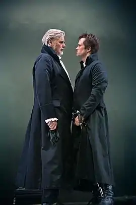The Prince of Homburg, an English stage adaptation by Dennis Kelly, was premiered at the Donmar Warehouse from 22 July to 4 September 2010, with the Elector played by Ian McDiarmid.[10] This adaptation altered the ending so that the Prince met with the Elector to accept the death sentence and to ask as his last wish that the Elector continue the war with Sweden rather than make peace. The Elector honours this dying wish of the Prince, though once the Prince has gone he tells his generals that he will only continue it three days and then make peace after all – he feels that the Prince almost lost him victory once by his impetuosity and will not lose it again at the Prince's request. Natalia scatters flowers where the Prince is to be shot, which he finds just before he is then shot, alone. The Elector then makes a speech exhorting his people to continue the war, but meets with hostile silence. This change of ending was criticised by drama critics, including Michael Billington of The Guardian[11][12]