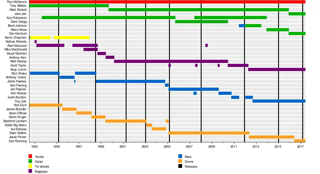 Founding member Paul McKenzie has been the only consistent member of the band since its inception. The band released its first album, Clash of the Tartans, in 1998.[3] McKenzie claims as many as 100 different musicians have performed as members of the band,[4] including piper Alan "Raven" MacLeod, of the pioneering Scottish folk band The Tannahill Weavers and "Bourne and MacLeod".