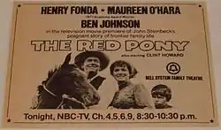The Red Pony is a 1973 American made-for-television drama western film directed and co-written by Robert Totten, based on the 1937 novel The Red Pony by John Steinbeck. The film features Henry Fonda, Maureen O'Hara, Ben Johnson and Jack Elam.[1]