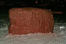 The Rock was unearthed in 1873 near what is now the corner of Grand River Avenue (M-43) and Michigan Avenue in East Lansing, Michigan. It was donated to the (Michigan) State Agricultural College by the class of 1873. The college placed the rock in the "Sacred Space" near the modern day Beaumont Tower, where the stone became a common hangout for young couples and became known as the "Engagement Rock". By the late 20th Century, the rock had become better known for protest slogans than engagement photos. In 1985, it was moved to its current location, east of Farm Lane, on the north bank of the Red Cedar River. Today, the innumerable layers of paint obliterate the original inscription: "Class '73".[1]