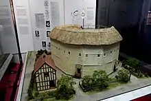 The theatre was built by the carpenter John Griggs.[2] The new building was of timber, with a lath and plaster exterior and thatch roof. In shape it was a fourteen-sided polygon, of about 72 feet (22 m) in external diameter.[3] The inner space was also a fourteen-sided polygon, about 47 feet (14 m) wide. Modern calculations show that the dimensions and fourteen-sided layout were dictated by the use of the standard 16th-century measure of one rod as a base and the carpenter's "rule of thumb" method of dividing a circle into seven equal parts, subdivided.[3]