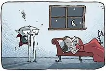 Over the course of the series, the Sabertooth Vampire routinely finds himself heavily burdened by his short stature and the weight of his long, cumbersome fangs. Nevertheless, this hasn't prevented him from embarking on a series of misadventures that have included trips into outer space, failed attempts at romance, car chases, roller derbies and a starring role in a commercial for a cereal called "Saber O's." He is often aided and rescued from various predicaments by Renfield, the character from Bram Stoker's 1897 novel Dracula. The strip's second season concludes with a cliffhanger after the Sabertooth Vampire uses a spray called "Vamp Away" to turn into a human after becoming frustrated with his long fangs and inability to shave with a mirror. His transformation renders him a mortal but, unfortunately, one with humongous incisors. Unsatisfied with his new form, in the strip's final panel he begs a group of disdainful vampires to turn him back into a member of the undead.