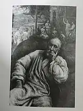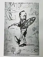 Pierre Puvis de Chavannes was a well regarded painter during his life however his popularity diminished after his death, unlike most renowned artists. Before The Sacred Grove commission, he had paintings adorning the walls of the Panthéon in Paris as well as many other museums throughout France, including those in Poitiers and Marseilles.[3] The Sacred Grove was the first of Puvis’ paintings to be developed from an easel version and unlike his other pieces did not depict historical events or well known geographical landscapes.[3] Critics were unsure of the painting due to its different nature and unconventional creation, as well as its lack of explanation by Puvis when the showcase version was displayed in the Salon.[6] The artist's good reputation then started to decrease substantially when Henri de Toulouse Lautrec parodied The Sacred Grove and mocked Puvis’ more traditional artistry. A caricature was done in 1886 of Puvis, after The Sacred Grove had already been severely critiqued, presenting the artist as wandering aimlessly in one of his own fantastical landscapes.[3] In 1884, there was also a caricature completed but of the painting itself rather than the painter, which greatly exaggerated the figures in The Sacred Grove and their movements.[3]