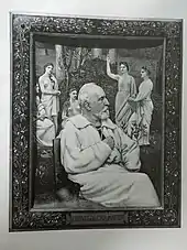The original piece in Lyons stemmed from a showcase piece which was a smaller painting (93 x 231 cm) exhibited without an explanatory text at the Paris Salon of 1884, where it won that year's grand prize.[3] It acted as a test of The Sacred Grove’s success before the final version was to be displayed in the museum.