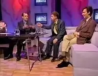 ![]() Armando Iannucci, Peter Baynham and David Schneider presenting the 1 July 1995 episode of The Saturday Night Armistice. The "Mr Tony Blair" prop is visible to the left of Iannucci. | |