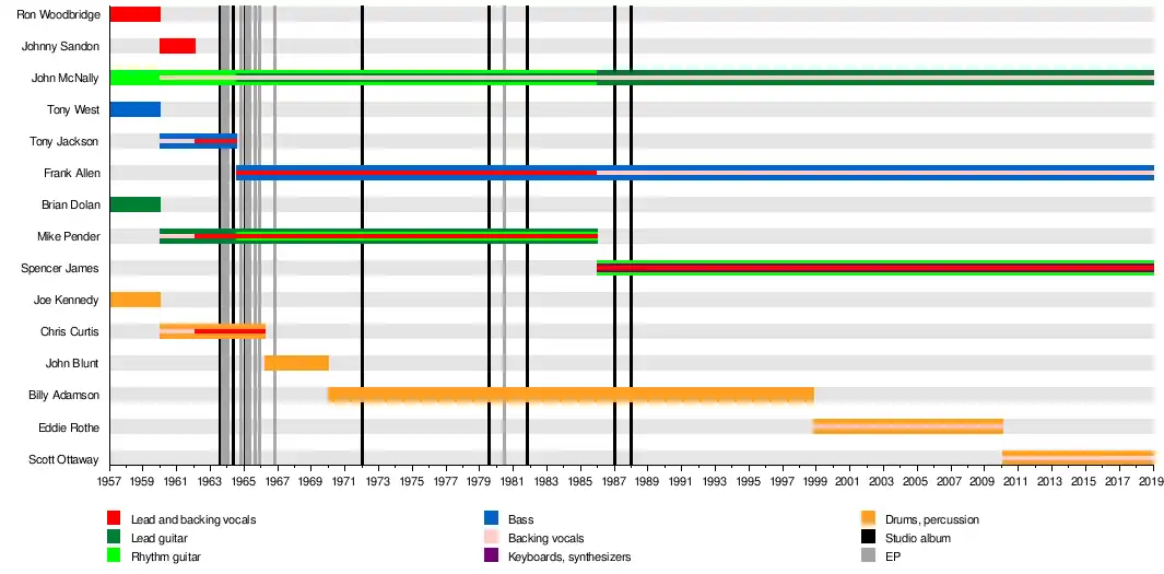 | Past members | John McNally Frank Allen Spencer James Scott Ottaway Tony Jackson Mike Pender Chris Curtis Billy Adamson John Blunt Norman McGarry Eddie Rothe Ron Woodbridge Brian Dolan Tony West Joe Kennedy Johnny Sandon |