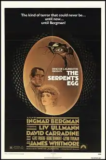The Serpent's Egg is a 1977 American-West German drama film written and directed by Ingmar Bergman and starring David Carradine and Liv Ullmann. The story is set in 1920s Berlin and features English and German dialogue. It was Bergman's only Hollywood film. The title is taken from a line spoken by Brutus in Shakespeare's Julius Caesar: And therefore think him as a serpent's egg / Which hatch'd, would as his kind grow mischievous; / And kill him in the shell. Even though the film was a critical and commercial failure upon its initial release, Bergman was reported to be happy with the film.[1]