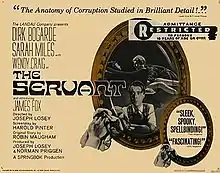 The Servant is a 1963 British drama film directed by Joseph Losey. It was written by Harold Pinter, who adapted Robin Maugham's 1948 novella. The Servant stars Dirk Bogarde, Sarah Miles, Wendy Craig and James Fox. It opened at London's Warner Theatre on 14 November 1963.[2]