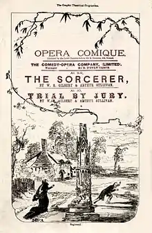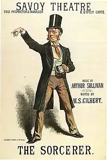The Sorcerer opened on 17 November 1877 at the Opera Comique, preceded by Dora's Dream, a curtain-raiser composed by Sullivan's assistant Alfred Cellier, with words by Arthur Cecil, a friend of both Gilbert's and Sullivan's.[28] Busy with last-minute cuts and changes the day before the show opened, Sullivan had no time to write an overture and used the "Graceful Dance" music from his incidental music to Henry VIII, together with a few measures of music from "Oh Marvellous Illusion", as an overture. For the 1884 revival, an overture was composed by Sullivan's assistant, Hamilton Clarke.[28] Gilbert's meticulous rehearsal of the cast was noticed and commented on favourably by the critics, and the opening-night audience was enthusiastic.[30] The Sorcerer ran for 178 performances, making a profit.[31] A touring company also began playing the opera in March 1878.[32] D'Oyly Carte continued touring the piece in the early 1880s.[33] Unauthorised productions played on Broadway and elsewhere in the U.S. beginning by 1879.[34][35] The original London sets were by W. Beverly, and costumes were by C. Wilhelm.[36]