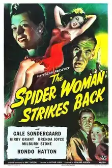 The Spider Woman Strikes Back is a 1946 horror film starring Gale Sondergaard, with a running time of 59 minutes. Despite the similar title and role played by Sondergaard, the film is not a sequel to the Sherlock Holmes film, The Spider Woman. In The Spider Woman, Sondergaard's character is named Adrea Spedding.[1] This time it is Zenobia Dollard.[2][3]