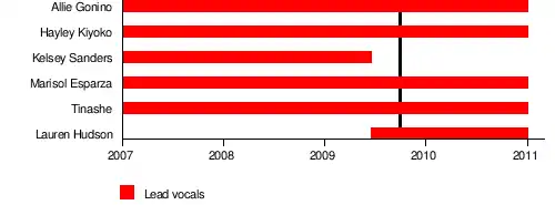 ![]() The original line-up, from left to right – Gonino, Tinashe, Esparza, Kiyoko and Sanders – performing live at Celebrity Basketball Game, in 2009. | |