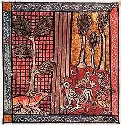 Schir Lowrence, a fox "full sair hungrie," creeps one morning early into the farmyard which neighbours the "thornie schaw of grit defence" which is "his residence." He stalks Chanticleir, a cockerel owned by a poor widow highly dependent on her small flock of hens. Pretending he has come to serve Chanticleir, Lowrence uses flattery to praise the bird's voice and trick him into singing on tiptoe with his eyes closed in the manner, supposedly, of his father who he claims also to have served. So close a friend he was to the bird's father that the tod was present at his death to hald his heid and gif him drinkis warme ... syne [say] the dirigie quhen that he wes deid. This complex web of flattery and highly ambiguous assurance persuades Chanticleir to perform the foolish act, allowing Lowrence swiftly to hint him be the throte and hy with him to the wood.