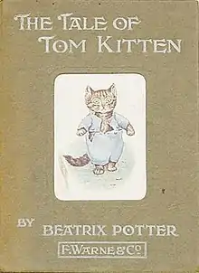 The Tale of Tom Kitten is a children's book, written and illustrated by Beatrix Potter. It was released by Frederick Warne & Co. in September 1907. The tale is about manners and how children react to them. Tabitha Twitchit, a cat, invites friends for tea. She washes and dresses her three kittens for the party, but within moments the kittens have soiled and lost their clothes while scampering about the garden. Tabitha is "affronted". She sends the kittens to bed, and tells her friends the kittens have the measles. Once the tea party is underway however, its "dignity and repose" are disturbed by the kittens romping overhead and leaving a bedroom in disorder.