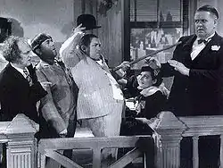 The Stooges were required to release up to eight short films per year within a 40-week period; for the remaining 12 weeks, they were free to pursue other employment, time that was either spent with their families or touring the country to promote their live act.[9] The Stooges appeared in 190 film shorts and five features while at Columbia, outlasting every one of their contemporaries employed in the short-film genre. Del Lord directed more than three dozen Stooge films, Jules White directed dozens more and his brother Jack White directed several under the pseudonym "Preston Black". Silent film star Charley Chase also shared directorial responsibilities with Lord and White.[8]