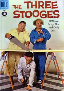 The early days of television provided movie studios a place to unload a backlog of short films that they thought otherwise unmarketable, and the Stooge films seemed perfect for the burgeoning genre. ABC had even expressed interest as far back as 1949, purchasing exclusive rights to 30 of the trio's shorts and commissioning a pilot for a potential series, Jerks of All Trades.[22] However, the success of television revivals for such names as Laurel and Hardy, Woody Woodpecker, Popeye, Tom and Jerry and the Our Gang series in the late 1950s led Columbia to cash in again on the Stooges. In September 1958, Columbia's television subsidiary Screen Gems offered a package consisting of 78 Stooge shorts (primarily from the Curly era), which were well received.[23] An additional 40 shorts hit the market in April 1959; by September 1959, all 190 Stooge shorts were airing regularly. With so many films available for broadcast, daily television airings provided heavy exposure aimed squarely at children. Parents who had grown up seeing the same films in the theaters began to watch alongside their children and, before long, Howard, Fine and DeRita were in high demand.[8] After it was discovered that the Curly-era shorts were the most popular, Moe suggested that DeRita shave his head to accentuate his slight resemblance to Curly Howard.[4] He adopted first a crew cut and later a completely shaven head, thus becoming "Curly Joe".