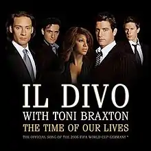 "The Time of Our Lives" is a song recorded by multinational operatic pop quartet Il Divo and American R&B singer Toni Braxton to serve as the official theme song for the 2006 FIFA World Cup football (soccer) tournament. Written by Jörgen Elofsson and produced by Steve Mac, the song appears on the compilation album Voices from the FIFA World Cup (2006) and on the 2006 European re-release of Braxton's fifth studio album, Libra.