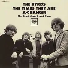 "The Times They Are a-Changin'" was one of two Dylan covers that the Byrds included on their second album, Turn! Turn! Turn!, with "Lay Down Your Weary Tune" being the other.[12] Like other Dylan compositions that the band had covered, such as "Mr. Tambourine Man" and "All I Really Want to Do", the song was intended to be the A-side of a single. It was sung by bandleader Jim McGuinn and prominently features his signature twelve-string Rickenbacker guitar. The song was often played at concerts surrounding its release.[13]