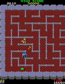 The Tower of Druaga[lower-alpha 1] is a 1984 action role-playing maze arcade game developed and published in Japan by Namco. Controlling the golden-armored knight Gilgamesh, the player is tasked with scaling 60 floors of the titular tower in an effort to rescue the maiden Ki from Druaga, a demon with eight arms and four legs, who plans to use an artifact known as the Blue Crystal Rod to enslave all of mankind. It ran on the Namco Super Pac-Man arcade hardware, modified with a horizontal-scrolling video system used in Mappy.