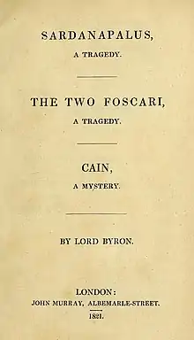 The Two Foscari: An Historical Tragedy (1821) is a verse play in five acts by Lord Byron. The plot, set in Venice in the mid-15th century, is loosely based on the true story of the downfall of doge Francesco Foscari and his son Jacopo.[1] Byron's play formed the basis of Verdi's opera I due Foscari.