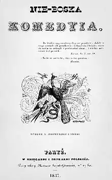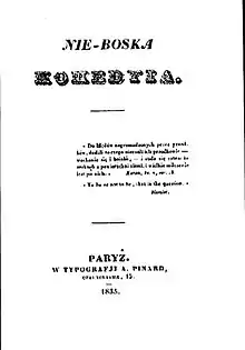 The Undivine Comedy or The Un-divine Comedy, also The Non-Divine Comedy (Polish: Nie Boska komedia or Nie-boska komedia),[lower-alpha 1] is a play written by Polish Romantic poet Zygmunt Krasiński in 1833, published anonymously in 1835.[6] Its main theme is sociopolitical conflict – in Krasiński's words, "[between] aristocracy and democracy". It is Krasiński's best-known work[7][6][8] and is regarded as one of the most important works of Polish Romantic literature.[9][10][11]