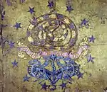The United Companies of the Train of Artillery of the Town of Providence, known as UTA, is a member of the Rhode Island Historic Commands, and takes part in many reenactments and state events. The unit was raised during the American Revolutionary War from the Fusiliers of Providence and the Artillery Company of Providence, making it one of the largest artillery units in Rhode Island. They fought at the Battle of Rhode Island and many other battles in the American Revolutionary War. The unit used a distinctive flag[2] which featured a coiled timber rattlesnake with the motto "Do Not Tread On Me", above an anchor and the motto "In God We Hope", and a pair of cannons. The motif was surrounded by thirteen stars on a field of gold. This flag is one of the earliest uses of a rattlesnake on a flag and may have been the basis for the Gadsden flag. It is also one of the first uses of a circle of 13 stars to represent the thirteen colonies.[3]