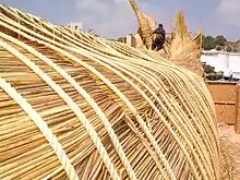 The reeds are then made into over 30 long cylinders or "chorizos", 1.5 feet (0.46 m) in diameter which are made the length of the boat. These form the main bulk of the ship. The jig is built next. This serves as a mold, constructed with eucalyptus poles every three feet, running perpendicular to the hull supported by poles from the ground. Two smaller boats that looked similar to "whales" are made to add rigidity to the boat with the technique the same as main hull, described later. They are laid side by side on top of the mold. The roles are laid on top of the "whales" until they form two large separate bundles.