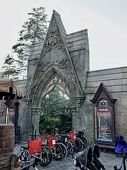The first phase was officially announced for Islands of Adventure on May 31, 2007,[9][10] and after a two-and-a-half-year construction period, the area officially opened to the public on June 18, 2010.[1][11] The area's flagship ride is Harry Potter and the Forbidden Journey, which exists within a re-creation of Hogwarts School of Witchcraft and Wizardry. It takes riders on a journey through Harry Potter's wizarding world.[12] The Wizarding World of Harry Potter also contains Flight of the Hippogriff, a family roller coaster, and formerly included Dragon Challenge, a pair of inverted roller coasters, which was replaced in 2019 by a new roller coaster, Hagrid's Magical Creatures Motorbike Adventure. The area also features a re-creation of Hogsmeade containing many gift shops and restaurants from the novels including Dervish and Banges, Honeydukes, Ollivanders, Zonko's Joke Shop (though it houses Honeydukes), the Three Broomsticks, and the Hog's Head.