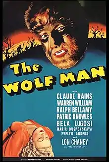 The Wolf Man is a 1941 American horror film written by Curt Siodmak and produced and directed by George Waggner. The film stars Lon Chaney Jr. in the title role. Claude Rains, Warren William, Ralph Bellamy, Patric Knowles, Bela Lugosi, Evelyn Ankers, and Maria Ouspenskaya star in supporting roles. The title character has had a great deal of influence on Hollywood's depictions of the legend of the werewolf.[2] The film is the second Universal Pictures werewolf film, preceded six years earlier by the less commercially successful Werewolf of London (1935).
