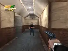 The World Is Not Enough is a first-person shooter based on MGM's 1999 James Bond film of the same name, where the player assumes the role of James Bond through 11 different missions.[1] In each mission, the player must complete a number of objectives while defeating enemies controlled by the game's artificial intelligence. Objectives range from rescuing hostages to destroying vehicles and collecting items.[1] Some objectives require the player to use numerous high-tech gadgets. For example, the Credit Card Lockpick can be used to open locked doors, while the Micro Camera is useful for photographing evidence.[2] There is one mission that does not involve combat, and requires the player to play blackjack in a casino and win consistently.[1]