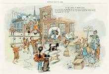 The Yellow Kid is also famous for its connection to the coining of the term "yellow journalism."[2] The idea of "yellow journalism" was the sensationalized stories for the sake of selling papers, which was named from the "Yellow Kid" cartoons. Although a cartoon, Outcault's work aimed its humor and social commentary at Pulitzer's adult readership. The strip has been described as "... a turn-of-the-century theater of the city, in which class and racial tensions of the new urban, consumerist environment were acted out by a mischievous group of New York City kids from the wrong side of the tracks."[3]