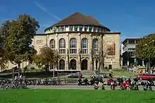 Construction of the present day theatre was started in 1905 under Otto Winterer, Lord Mayor of Freiburg at the time. It was designed by the Berlin architect Heinrich Seeling in an eclectic style combining a Neo-Baroque building with Art Nouveau decorative elements and built on the site of the former "Dauphin" bastion, part of Vauban's town fortifications.[1] The architectural sculptures were modelled out of plaster by Hermann Feuerhahn and realised by six sculptors from Freiburg: Julius Seitz, his students Louis Granget, Theodor Hengst and August Muessle, along with Ludwig Kubanek and a Berlin colleague, Albert Mayer. The building was opened to the public on October 8, 1910, with performances of both Wallenstein's Camp by Friedrich Schiller and the “Festwiese” from Richard Wagner's The Mastersingers of Nuremberg.[1]