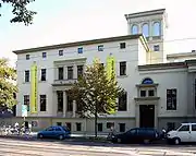The playhouse is located at 64 Otto-von-Guericke-Straße (52.1236°N 11.6287°E). It was originally built as the Magdeburg residence of the industrialist Ferdinand Friedrich August Klusemann and known as the Villa Klusemann.[2] In 1906 it was sold to the company Harmonie-Gesellschaft who converted into an exclusive venue for dancing, lectures, concerts, and social gatherings. It was occupied by American troops immediately after World War II and then converted into a provisional theatre for the city. From 1990 until its merger into Theater Magdeburg, it was known as the Freie Kammerspiele after its resident ensemble.[2]