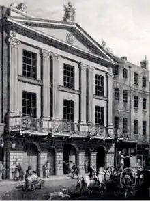 Garrick commissioned Robert Adam and his brother James to renovate the theatre's interior, which they did in 1775. Their additions included an ornate ceiling and a stucco facade facing Bridges Street. This facade was the first time any structure that might be considered part of the theatre proper actually abutted the street: the building, like the 1663 original, had been built in the centre of the block, hemmed in by other structures. The narrow passage from Bridges street to the theatre now became an interior hallway; some theatre office space also went up behind the new facade.[48]