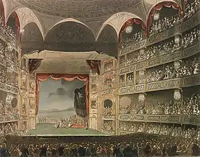 Productions relying more on scenery and effects than on dialogue and acting remained commonplace in the new facility. The 1823 production of Cataract of the Ganges had a finale featuring a horseback escape up a flowing cataract "with fire raging all around."[69] Effects for an 1829 production were produced by hydraulic apparatus that reportedly could discharge 39 tons of water.[70]