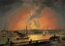 The comedy actor John Bannister became acting-manager in 1802. With Sheridan's son Tom, and in the circle of Richard Wroughton (stage-manager), William Dowton, Michael Kelly, Tom Dibdin and their likes, he helped to see the Theatre Royal through its next catastrophe.[63] On 24 February 1809, despite the previously mentioned fire safety precautions, the theatre burned down. On being encountered drinking a glass of wine in the street while watching the fire, R.B. Sheridan was famously reported to have said: "A man may surely be allowed to take a glass of wine by his own fireside."[64] Already on the shakiest financial ground, Sheridan was ruined entirely by the loss of the building. He turned to brewer Samuel Whitbread, an old friend, for help.[65] As well as investing strongly in the project, Whitbread agreed to head a committee that would manage the company and oversee the rebuilding of the theatre, but asked Sheridan to withdraw from management himself, which he did entirely by 1811.[66]