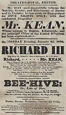 From the 1840s there was a demand to commemorate serious theatre, with the "Shakespeare Committee" purchasing the playwright's birthplace for the nation demonstrating a recognition of the importance of 'serious drama'. The following year saw more pamphlets on a demand for a National Theatre from London publisher, Effingham William Wilson.[44] The situation continued, with a renewed call every decade for a National Theatre. In 1879 the residency of the Comédie-Française at the Gaiety Theatre inspired further demands, including: a structure in the capital that would present "exemplary theatre"; that would form a permanent memorial to Shakespeare; a supported company that would represent the best of British acting; and a theatre school.[45] A London Shakespeare League was founded in 1902 to develop a Shakespeare National Theatre and – with the impending tri-centenary in 1916 of his death – in 1913 purchased land for a theatre in Bloomsbury. This work was interrupted by World War I. Finally, in 1948, the London County Council presented a site close to the Royal Festival Hall for the purpose, and a "National Theatre Act", offering financial support, was passed by Parliament in 1949.[46] In July 1962, a board was set up to supervise construction of a National Theatre on the South Bank site and a separate board was constituted to run a National Theatre Company and lease the Old Vic theatre. The Company was to remain at the Old Vic until 1976, when the new South Bank building was opened.