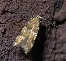 The basal third of the forewings is brown, edged with black distally. The remainder of the wing is paler brown with a yellowish antemedial line and blackish triangle half-way along the costa, bordered distally by a yellowish wedge. There is a black discal dot near the middle of the wing.