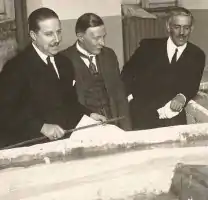 ![]() Theodor Rehbock (center) during the presentation of a hydraulics model to the client. On the left the chief engineer (German: Oberingenieur) of the hydraulics laboratory at the University of Karlsruhe; on the right the client of the research conducted in the hydraulics model experiments. | |