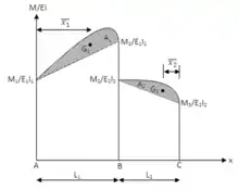 where a1 is the area on the bending moment diagram due to vertical loads on AB, a2 is the area due to loads on BC, x1 is the distance from A to the centroid of the bending moment diagram of beam AB, x2 is the distance from C to the centroid of the area of the bending moment diagram of beam BC.