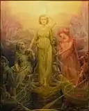 Florence Fuller (1867–1946)[77] joined the Theosophical Society in 1905.[78] In the same year, she created A Golden Hour "widely regarded as a national Australian masterpiece."[79] From 1908 to 1911 in Adyar, she painted portraits of the leaders of the Theosophical Society and the Theosophical Masters.[80] [note 12]